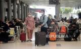Sejumlah penumpang kereta api mengantri untuk dilakukan pengecekan tiket di Stasiun Senen, Jakarta, Selasa (21/12). Jelang libur Natal dan Tahun Baru kepadatan penumpang kereta api jarak jauh mulai terlihat di stasiun Senen.Prayogi/Republika (FOTO : Prayogi/Republika.)