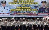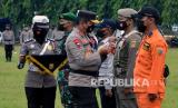 REPUBLIKA.CO.ID, LAMPUNG -- Kapolda Lampung Irjen Pol Hendro Sugiatno (kedua kiri) memasangkan pita kepada perwakilan petugas tanda dimulainya Operasi Lilin Krakatau 2021 dan Pengamanan Muktamar ke-34 NU 2021 di Lapangan Korpri Bandar Lampung, Lampung, Selasa (21/12/2021). Kegiatan dilaksanakan untuk memberikan keamanan dan kenyamanan jelang perayaan Natal 2021 dan Tahun Baru 2022 serta bagi peserta Muktamar NU ke-34. Ard
