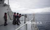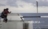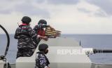 REPUBLIKA.CO.ID, LAUT JAWA -- Prajurit TNI AL awak dari KRI Teluk Bintuni 520 menembakkan meriam 40 mm amunisi jenis HEIT dan Practice saat peran tempur bahaya udara dan bahaya permukaan saat berlayar di Laut Jawa, Selasa (21/12/2021).