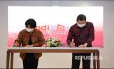 REPUBLIKA.CO.ID, JAKARTA -- PT Telkom Indonesia Tbk menjalin kerjasama dengan penyedia layanan media streaming digital linear TV dan Video on Demand PT Global Mediacom Tbk (MNC Media) di Jakarta, Selasa (21/12). Penandatanganan dilakukan Direktur Consumer Service Telkom Venusiana bersama Executive Chairman MNC Group Hary Tanoesoedibjo.