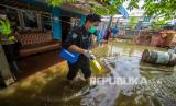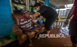 Vaksinasi dilakukan dari rumah ke rumah ditengah banjir untuk meninglatkan capaian target vaksin serta mencapai kekebalan komunal menuju Indonesia sehat bebas COVID-19.