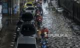 Sejumlah kendaraan terjebak kemacetan saat terjadi genangan air di Jalan Ciledug Raya, Kebayoran Lama, Jakarta, Selasa (21/12). Genangan air setinggi 30 sentimeter itu terjadi karena hujan deras yang mengguyur Jakarta serta buruknya drainase di kawasan tersebut. Republika/Putra M. Akbar (FOTO : Republika/Putra M. Akbar)