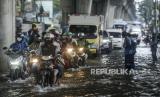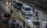 Sejumlah kendaraan melewati genangan air di Jalan Ciledug Raya, Kebayoran Lama, Jakarta, Selasa (21/12). Genangan air setinggi 30 sentimeter itu terjadi karena hujan deras yang mengguyur Jakarta serta buruknya drainase di kawasan tersebut. (FOTO : Republika/Putra M. Akbar)