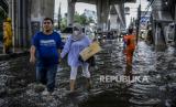 Warga berjalan melewati genangan air di Jalan Ciledug Raya, Kebayoran Lama, Jakarta, Selasa (21/12). Genangan air setinggi 30 sentimeter itu terjadi karena hujan deras yang mengguyur Jakarta serta buruknya drainase di kawasan tersebut. (FOTO : Republika/Putra M. Akbar)
