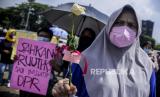 Sejumlah massa aksi yang tergabung dalam Jaringan Pembela Hak Perempuan Korban Kekerasan Seksual melakukan unjuk rasa di depan Gedung DPR, Jakarta, Rabu (22/12). Pada aksi tersebut mereka menuntutu DPR RI mengesahkan Rancangan Undang-undang Tindak Pidana Kekerasan Seksual (RUU TPKS) sebagai RUU Inisiatif DPR RI pada sidang paripurna DPR pembukaan masa sidang 13 Januari 2022 sebagai bentuk perempuan Indonesia bebas dari kekerasan dan pelecehan seksual. (FOTO : Republika/Putra M. Akbar)