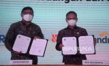 Komisioner BP Tapera Adi Setianto (kanan) bersama Dirjen Perbendaharaan Kementerian Keuangan Hadiyanto (kiri) menunjukan nota penandatanganan perjanjian investasi antara Kementerian Keuangan dan BP Tapera di Jakarta, Rabu (22/12). BP Tapera resmi bertindak sebagai Operator Investasi Pemerintah (OIP) dalam menyalurkan dana Fasilitas Likuiditas Pembiayaan Perumahan (FLPP) pada tahun 2022. BP Tapera akan menyalurkan KPR Sejahtera FLPP sebesar Rp22 triliun atau setara dengan 200 ribu unit rumah pada tahun depan. (FOTO : Prayogi/Republika.)