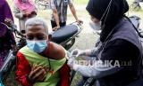 Tim kesehatan menyuntikkan vaksin COVID-19 kepada warga yang akan melakukan pencoblosan kepala desa di TPS 2 Desa Bunde, Mamuju, Sulawesi Barat, Rabu (22/12/2021). Berdasarkan Perda kabupaten Mamuju, warga yang tidak menunjukkan kartu vaksin COVID-19 tidak dapat melakukan pemilihan desa secara serentak di daerah tersebut. (FOTO : Antara/Akbar Tado)