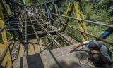 Warga secara swadaya memperbaiki jembatan gantung yang rusak di Rangkasbitung, Lebak, Banten, Rabu (22/12/2021). Jembatan gantung penghubung antardesa yang rusak parah tersebut diperbaiki melalui swadaya masyarakat dengan cara bergotong royong tanpa bantuan pemerintah setempat (FOTO : ANTARA/Muhammad Bagus Khoirunas)