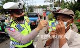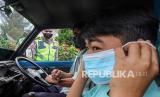 Petugas kepolisian membagikan masker kepada pengendara di Jalan Raya Puncak, Gadog, Kabupaten Bogor, Jawa Barat, Jumat (24/12/2021). Selain mengimbau pencegahan wabah COVID-19 Satlantas Polres Bogor juga membagikan masker gratis kepada pengguna jalan yang tidak menggunakan masker agar terhindar dari virus COVID-19. (FOTO : Antara/Yulius Satria Wijaya)