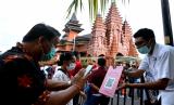 Umat Katolik memindai kode batang dengan aplikasi PeduliLindungi saat Misa Malam Natal di Gereja Katolik Roh Kudus Katedral Denpasar, Bali, Jumat (24/12/2021). Perayaan Natal di gereja tersebut dilakukan dengan menerapkan berbagai protokol kesehatan seperti dengan mewajibkan jemaat untuk memakai masker, mencuci tangan, membatasi kapasitas gereja serta menggunakan aplikasi PeduliLindungi sebagai upaya untuk untuk mencegah penyebaran COVID-19. (FOTO : ANTARA/Fikri Yusuf)