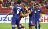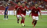 Egy Maulana Vikri dari Indonesia, tengah, merayakan gol keempat pada pertandingan leg kedua semifinal AFF Suzuki Cup 2020 antara Indonesia dan Singapura di Singapura, Sabtu, 25 Desember 2021. (FOTO : AP/Suhaimi Abdullah)