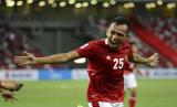 Pemain Indonesia Irfan Jaya melakukan selebrasi usai mencetak gol ketiga pada pertandingan leg kedua semifinal AFF Suzuki Cup 2020 antara Indonesia dan Singapura di Singapura, Sabtu, 25 Desember 2021. (FOTO : AP/Suhaimi Abdullah)