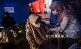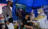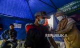 Petugas kesehatan menyuntikan vaksin Covid-19 kepada pengendara yang terjaring razia vaksin di jalur wisata Puncak, Kabupaten Bogor, Jawa Barat, Ahad (26/12). Razia vaksin Covid-19 itu ditujukan kepada pengendara yang akan melintas menuju kawasan wisata Puncak dan memberlakukan vaksin di tempat bagi yang kedapatan belum melakukan vaksinasi. Republika/Putra M. Akbar (FOTO : Republika/Putra M. Akbar)