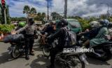Polisi menghentikan pengendara motor saat razia vaksin di jalur wisata Puncak, Kabupaten Bogor, Jawa Barat, Ahad (26/12). Razia vaksin Covid-19 itu ditujukan kepada pengendara yang akan melintas menuju kawasan wisata Puncak dan memberlakukan vaksin di tempat bagi yang kedapatan belum melakukan vaksinasi. Republika/Putra M. Akbar (FOTO : Republika/Putra M. Akbar)