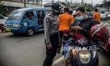REPUBLIKA.CO.ID,BOGOR -- Petugas gabungan menghentikan pengendara motor saat razia vaksin di jalur wisata Puncak, Kabupaten Bogor, Jawa Barat, Ahad (26/12).