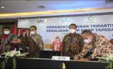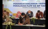REPUBLIKA.CO.ID, JAKARTA -- Direktur Consumer and Commercial Lending PT Bank Tabungan Negara (Persero) Tbk, Hirwandi Gafar menunjukkan Perjanjian Kerja Sama Tripartit Peralihan Fasilitas Likuiditas Pembiayaan (FLPP) ke BP Tapera disaksikan Dirjen Perumahan Kementerian PUPR Iwan Suprijanto, Sekretaris Jenderal Kementerian PUPR Mohammad Zainal Fatah dan Dirjen Pembiayaan Infrastruktur Pekerjaan Umum & Perumahan Kementerian PUPR Herry Trisaputra Zuna di Jakarta, Jumat (24/12).