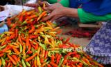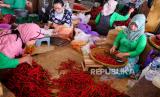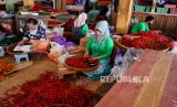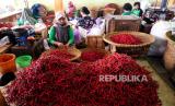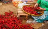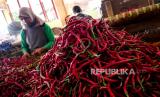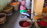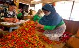 Pedagang menyortir cabai merah di Pasar Beringharjo, Yogyakarta, Senin (27/12). Harga cabai melambung tinggi di akhir tahun. Untuk cabai rawit per kilogram mencapai Rp 80 ribu. Sedangkan cabai merah keriting Rp 40 ribu perkilogram. Kenaikan harga cabai ini menurut pedagang imbas banyaknya gagal panen petani karena cuaca. (FOTO : Wihdan Hidayat / Republika)
