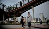 Pengunjung berswafoto di Skywalk Senayan Park, Jakarta, Senin (27/12). Kawasan tersebut menjadi salah satu objek wisata yang ramai dikunjungi oleh warga dengan menyajikan pemandangan lanskap perkotaan. Republika/Thoudy Badai (FOTO : Republika/Thoudy Badai)