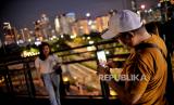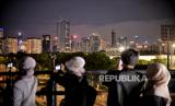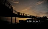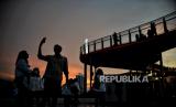 Pengunjung berfoto di Skywalk Senayan Park, Jakarta, Senin (27/12). Kawasan tersebut menjadi salah satu objek wisata yang ramai dikunjungi oleh warga dengan menyajikan pemandangan lanskap perkotaan. (FOTO : Republika/Thoudy Badai)