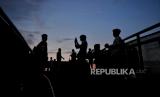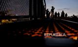 Pengunjung berfoto di Skywalk Senayan Park, Jakarta, Senin (27/12). Kawasan tersebut menjadi salah satu objek wisata yang ramai dikunjungi oleh warga dengan menyajikan pemandangan lanskap perkotaan. Republika/Thoudy Badai (FOTO : Republika/Thoudy Badai)