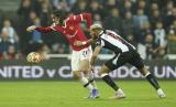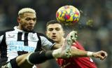 Pemain Newcastle Joelinton, kiri, berduel memperebutkan bola dengan pemain Manchester United Diogo Dalot selama pertandingan sepak bola Liga Utama Inggris antara Newcastle United dan Manchester United di St. James Park, Newcastle, Selasa (28/12/2021) dini hari WIB. (FOTO : AP/Jon Super)