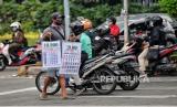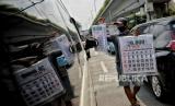 Pedagang musiman menawarkan kalender 2022 kepada pengendara di lampu merah kawasan Pancoran, Jakarta, Selasa (28/12). Menjelang pergantian tahun 2021 sejumlah pedagang musiman mulai marak terlihat dibeberapa area lampu merah di Jakarta. Mereka menjual kalender dengan harga Rp10 ribu dan Rp20 ribu tergantung ukurannya, dalam sehari mereka mampu menjual sebanyak 15 hingga 40 lembar kalender tahun 2022. Republika/Thoudy Badai (FOTO : Republika/Thoudy Badai)