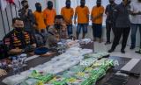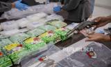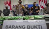 Kepala Pangkalan Sarana Operasi Bea Cukai Pantoloan Asep Ridwan (kiri) didampingi Kabid Humas Polda Sulteng Kompol Didik Supranoto (kedua kanan) menunjukkan barang bukti narkoba jenis sabu di Mapolda Sulteng di Palu, Sulawesi Tengah, Selasa (28/12/2021). Ditserse Narkoba Polda Sulteng bersama Bea Cukai Pantoloan menggagalkan penyelundupan narkoba jenis sabu sebanyak 29 kilogram dan menangkap lima orang tersangka yang salah satunya adalah warga negara Malaysia pada Sabtu (25/12). (FOTO : ANTARA/Basri Marzuki)