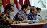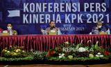 Ketua Komisi Pemberantasan Korupsi (KPK) Firli Bahuri (tengah) didampingi Wakil Ketua KPK Alexander Marwata (kanan) dan Nurul Ghufron (kiri) saat menyampaikan keterangan pers terkait kinerja Komisi Pemberantasan Korupsi tahun 2021 di Gedung Murah Putih, KPK, Jakarta, Rabu (29/12). Sepanjang tahun 2021 KPK telah melakukan upaya penindakan tindak pidana korupsi diantaranya penyelidikan 127 perkara, penyidikan 105 perkara, penuntutan 108 perkara, inkracht 90 perkara, eksekusi putusan 94 perkara dan jumlah tersangka 123 orang. Dari penanganan perkara tersebut, KPK berhasil melakukan asset recovery sebesar Rp 374,4 miliar. (FOTO : Republika/Thoudy Badai)