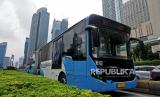 Sebuah bus TransJakarta berjalan melintasi kawasan Bundaran Hotel Indonesia, Jakarta, Kamis (30/12). Dinas Kesehatan DKI Jakarta menginginkan agar adaptasi kebiasaan baru dan protokol kesehatan (prokes) khususnya di angkutan umum tetap berkelanjutan untuk mengantisipasi ancaman penularan dari varian baru Covid-19 seperti omicron. Prayogi/Republika (FOTO : Prayogi/Republika.)