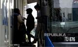 Sejumlah penumpang menaiki bus TransJakarta di halte Bundaran Hotel Indonesia,Jakarta, Kamis (30/12). Dinas Kesehatan DKI Jakarta menginginkan agar adaptasi kebiasaan baru dan protokol kesehatan (prokes) khususnya di angkutan umum tetap berkelanjutan untuk mengantisipasi ancaman penularan dari varian baru Covid-19 seperti omicron. Prayogi/Republika (FOTO : Prayogi/Republika.)