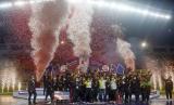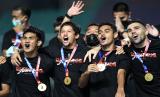 Sejumlah pesepak bola Persis Solo mengangkat piala usai menjuarai Liga 2 dalam laga Final Liga 2 di Stadion Pakansari, Cibinong, Kabupaten Bogor, Jawa Barat, Kamis (30/12/2021). Persis Solo mengalahkan Rans CIlegon dengan skor 2-1 dan berhasil menjuarai Liga 2 . (FOTO : ANTARA/Yulius Satria Wijaya)