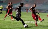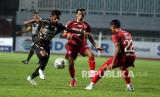 Pesepak bola Rans Cilegon Alfin Tuasalamony (kiri) dikawal ketat dua pesepak bola Persis Solo saat bertanding pada final Liga 2 di Stadion Pakansari, Cibinong, Kabupaten Bogor, Jawa Barat, Kamis (30/12/2021). (FOTO : Antara/Yulius Satria Wijaya)