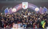REPUBLIKA.CO.ID,JAKARTA -- Sejumlah pesepak bola Persis Solo mengangkat piala usai menjuarai Liga 2 dalam laga Final Liga 2 di Stadion Pakansari, Cibinong, Kabupaten Bogor, Jawa Barat, Kamis (30/12/2021).