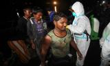 Pengungsi etnis Rohingya membantu temannya saat proses evakuasi di Pelabuhan ASEAN, Krueng Geukuh, Aceh Utara, Aceh, Jumat (31/12/2021). Pemerintah Indonesia melalui Satgas Penanganan Pengungsi Luar Negeri (PPLN) mempertimbangkan keadaan darurat dan sisi kemanusiaan sehingga memutuskan untuk menyelamatkan 120 orang etnis Rohingya terdiri dari tujuh laki-laki, 62 perempuan dan 51 anak-anak yang terdampar di perairan laut Aceh pada Sabtu (25/12/2021). (FOTO : ANTARA/Syifa Yulinnas)