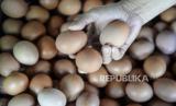 REPUBLIKA.CO.ID, JAKARTA -- Seorang pedagang menunjukkan telur ayam dagangannya di Pasar Malaka, Rorotan, Jakarta, Senin (3/1/2022). Badan Pusat Statistik (BPS) mencatat inflasi pada Desember 2021 sebesar 0,57 persen atau ada kenaikan pada Indeks Harga Konsumen (IHK) dari 107,5 pada November menjadi 107,66 sehingga inflasi sepanjang 2021 mencapai 1,87 persen, sama dengan inflasi dari tahun ke tahun.