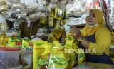 Seorang pedagang menunjukkan minyak goreng kemasan dagangannya di Pasar Malaka, Rorotan, Jakarta, Senin (3/1/2022). Badan Pusat Statistik (BPS) mencatat inflasi pada Desember 2021 sebesar 0,57 persen atau ada kenaikan pada Indeks Harga Konsumen (IHK) dari 107,5 pada November menjadi 107,66 sehingga inflasi sepanjang 2021 mencapai 1,87 persen, sama dengan inflasi dari tahun ke tahun. (FOTO : ANTARA/M Risyal Hidayat)