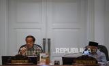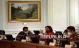 Menko Polhukam Mahfud MD (atas kanan), Menko PMK Muhadjir Effendy (kiri), Menko Perekonomian Airlangga Hartarto (bawah kanan) dan Mendagri Tito Karnavian menghadiri rapat terbatas terkait evaluasi pemberlakuan pembatasan kegiatan masyarakat (PPKM) di Kantor Presiden, Jakarta, Senin (3/1/2022). (FOTO : Antara/Sigid Kurniawan)