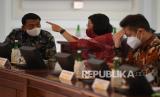 Menkeu Sri Mulyani (tengah) berbincang dengan Kepala Staf Presiden Moeldoko (kiri) dan Menkes Budi Gunadi Sadikin saat menghadiri rapat terbatas terkait evaluasi pemberlakuan pembatasan kegiatan masyarakat (PPKM) di Kantor Presiden, Jakarta, Senin (3/1/2022). (FOTO : Antara/Sigid Kurniawan)