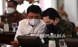 Menkominfo Johnny G Plate (kiri) berbincang dengan Menteri BUMN Erick Thohir saat menghadiri rapat terbatas terkait evaluasi pemberlakuan pembatasan kegiatan masyarakat (PPKM) di Kantor Presiden, Jakarta, Senin (3/1/2022). (FOTO : Antara/Sigid Kurniawan)