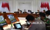 Presiden Joko Widodo (keempat kanan) didampingi Wakil Presiden Maruf Amin memimpin rapat terbatas terkait evaluasi pemberlakuan pembatasan kegiatan masyarakat (PPKM) di Kantor Presiden, Jakarta, Senin (3/1/2022). (FOTO : Antara/Sigid Kurniawan)