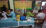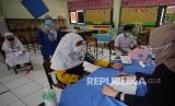 REPUBLIKA.CO.ID, JAKARTA -- Tenaga kesehatan menyuntikkan vaksin Covid-19 ke murid sekolah dasar (SD) di SDI Al Azhar 5 Kebayoran Lama, Jakarta, Senin (3/1/2022). Pada hari pertama pembelajaran tatap muka (PTM) yang dilaksanakan secara 100 persen tersebut pihak sekolah bekerja sama dengan Puskesmas Kebayoran Lama memberikan vaksinasi Covid-19 kepada seluruh murid.