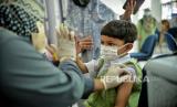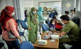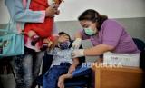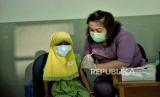 Tenaga kesehatan mengecek kesehatan anak sebelum menyuntikan vaksin Covid-19 saat vaksinasi khusus untuk TK/Paud/Raudhotul Athfal (RA) di TK Kartika X-16, Mampang Prapatan, Jakarta, Selasa (4/1). Pemerintah mencatat per 31 desember 2021 telah berhasil menyuntikan 280 juta dosis vaksin Covid-19 yang terdiri dari dosis 1 mencapai 165,2 juta dosis, dosis 2 mencapai 113,8 juta dosis, dan dosis 3 mencapai 1,3 juta dosis. (FOTO : Republika/Thoudy Badai)
