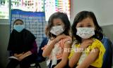 REPUBLIKA.CO.ID, JAKARTA -- menunjukan bekas suntik vaksin Covid-19 saat vaksinasi khusus untuk TK/Paud/Raudhotul Athfal (RA) di TK Kartika X-16, Mampang Prapatan, Jakarta, Selasa (4/1).