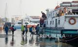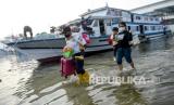 REPUBLIKA.CO.ID, JAKARTA -- Calon penumpang antre untuk menaiki kapal motor saat terjadinya banjir rob di Pelabuhan Kali Adem, Muara Angke, Jakarta, Rabu (5/1/2022).