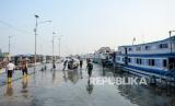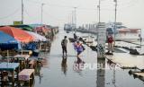 Warga beraktivitas saat terjadinya banjir rob di Pelabuhan Kali Adem, Muara Angke, Jakarta, Rabu (5/1/2022). Menurut Badan Meteorologi Klimatologi dan Geofisika (BMKG), adanya fase bulan baru yang bersamaan dengan masa Perigee (jarak terdekat bulan ke bumi) menyebabkan terjadinya peningkatan secara signifikan ketinggian pasang air laut mencapai maksimum. (FOTO : Antara/M Risyal Hidayat)