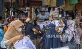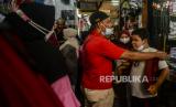 Pedagang seragam sekolah melayani calon pembeli di Pasar Mester Jatinegara, Jakarta, Rabu (5/1). Menurut pedagang, penjualan seragam sekolah mengalami peningkatan setelah seluruh sekolah di DKI Jakarta melaksanakan pembelajaran tatap muka (PTM) berkapasitas 100 persen dengan menerapkan protokol kesehatan Covid-19. (FOTO : Republika/Putra M. Akbar)