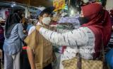 Calon pembeli mengukur seragam sekolah untuk anaknya di Pasar Mester Jatinegara, Jakarta, Rabu (5/1). Menurut pedagang, penjualan seragam sekolah mengalami peningkatan setelah seluruh sekolah di DKI Jakarta melaksanakan pembelajaran tatap muka (PTM) berkapasitas 100 persen dengan menerapkan protokol kesehatan Covid-19. Republika/Putra M. Akbar (FOTO : Republika/Putra M. Akbar)