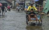 Warga menaiki becak saat terjadi banjir rob di kawasan Muara Angke, Jakarta, Rabu (5/1). Banjir rob dengan ketinggian 30 hingga 50 sentimeter tersebut merendam ratusan rumah warga di kawasan Muara Angke dan memutus akses jalan menuju Dermaga Kali Adem. Republika/Putra M. Akbar (FOTO : Republika)