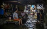 Warga duduk santai saat terjadi banjir rob di kawasan Muara Angke, Jakarta, Rabu (5/1). Banjir rob dengan ketinggian 30 hingga 50 sentimeter tersebut merendam ratusan rumah warga di kawasan Muara Angke dan memutus akses jalan menuju Dermaga Kali Adem. Republika/Putra M. Akbar (FOTO : Republika)