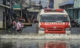 Mobil ambulans melintas saat terjadi banjir rob di kawasan Muara Angke, Jakarta, Rabu (5/1). Banjir rob dengan ketinggian 30 hingga 50 sentimeter tersebut merendam ratusan rumah warga di kawasan Muara Angke dan memutus akses jalan menuju Dermaga Kali Adem. Republika/Putra M. Akbar (FOTO : Republika)